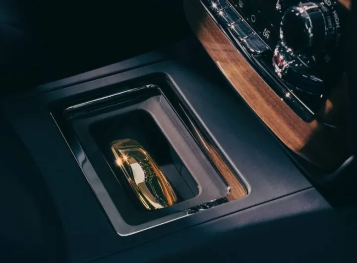 Rolls-Royce Phantom Goldfinger centrinėje konsolėje yra tvirtas 18 karatų aukso luitas Phantom Goldfinger pagal užsakymą sukurtame dizaino...